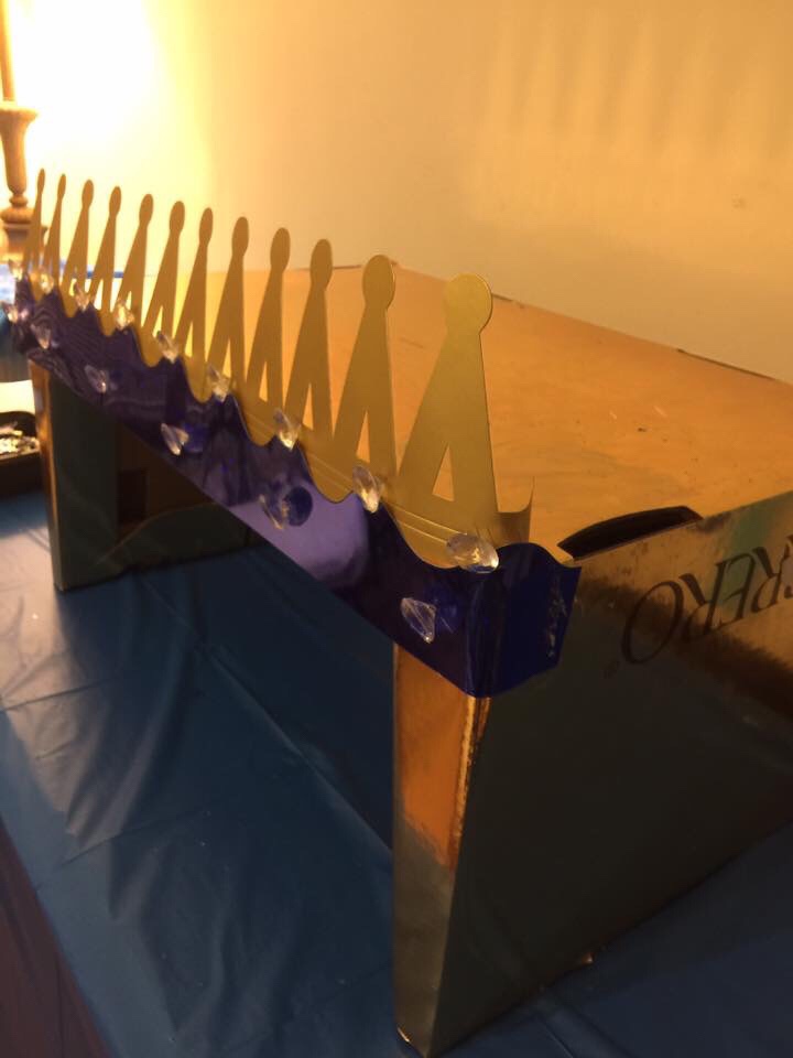 Buy gold crown from Dollar Store and apply to Front apply crown open up and glue accross
